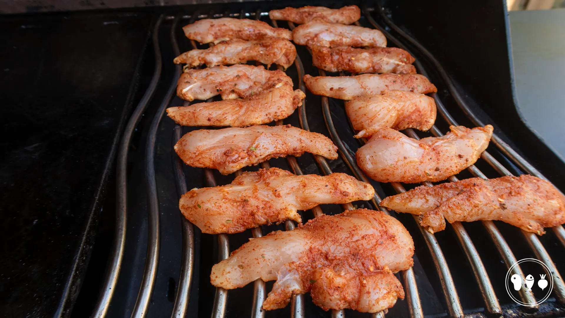 Leg de gemarineerde kip op de hete grill en bak tot de kerntemperatuur 72 °C bereikt wordt. Draai halverwege en bestrijk opnieuw met wat van de marinade, circa 4–6 minuten per kant afhankelijk van de dikte.