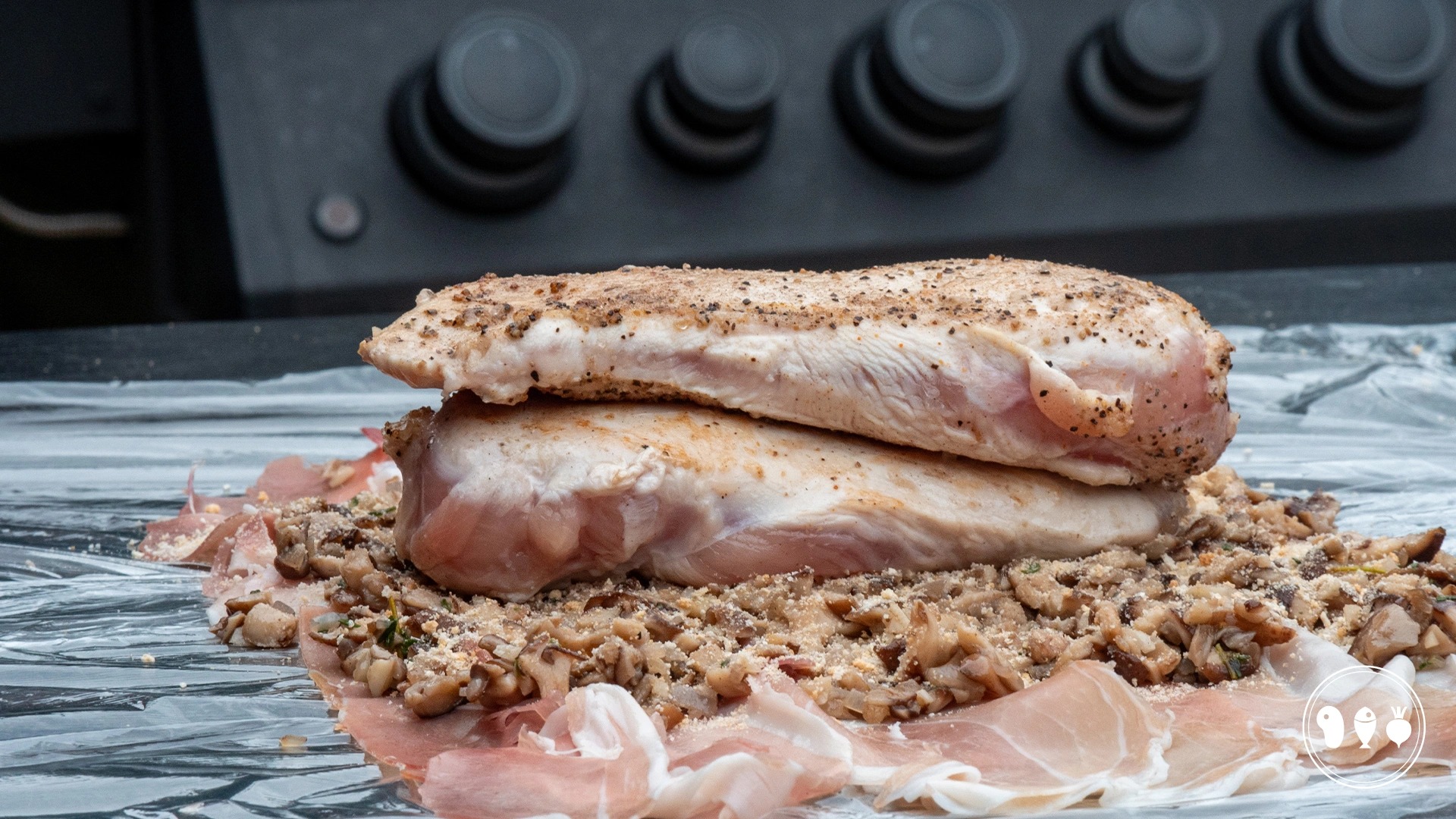 Verdeel de afgekoelde duxelles met een handje paneer over de prosciutto en leg daarop de twee kipfilets. Spiegel de filets zodat ze mooi op elkaar passen.