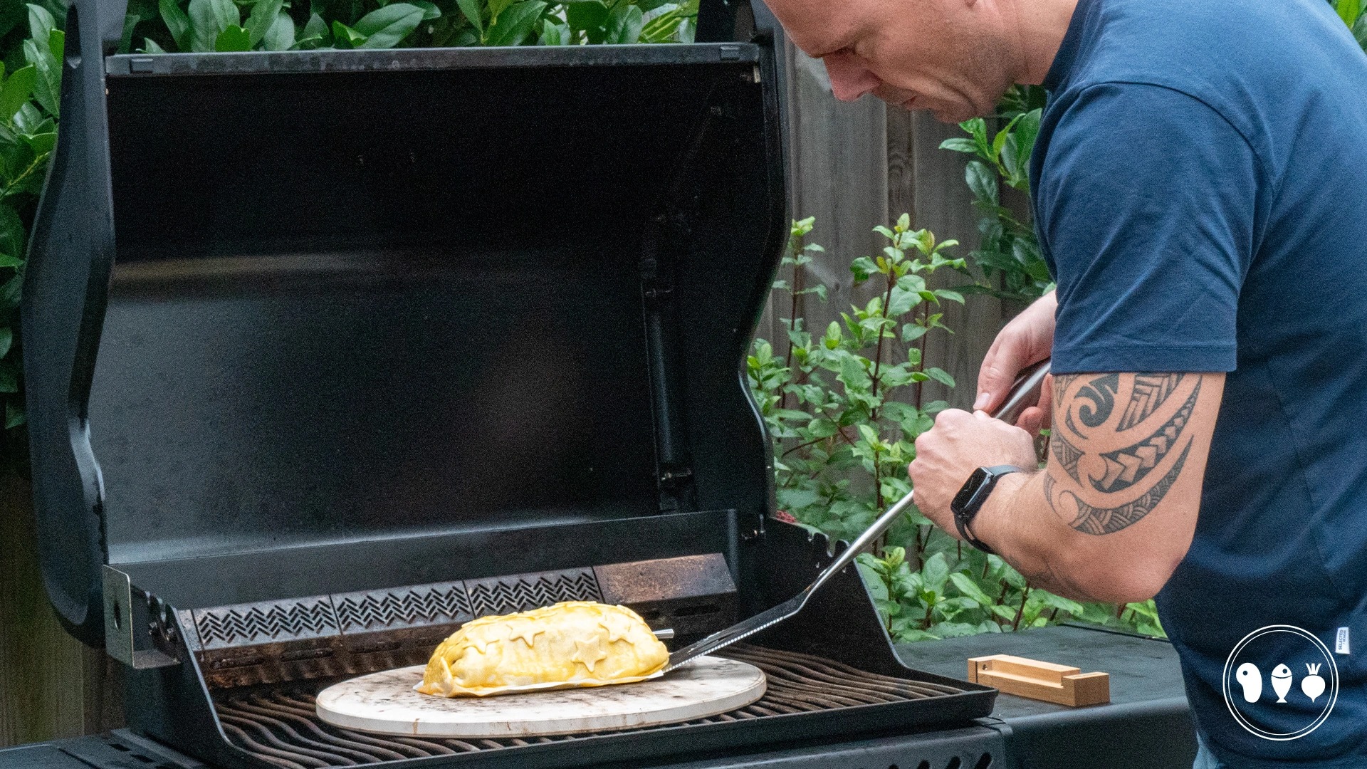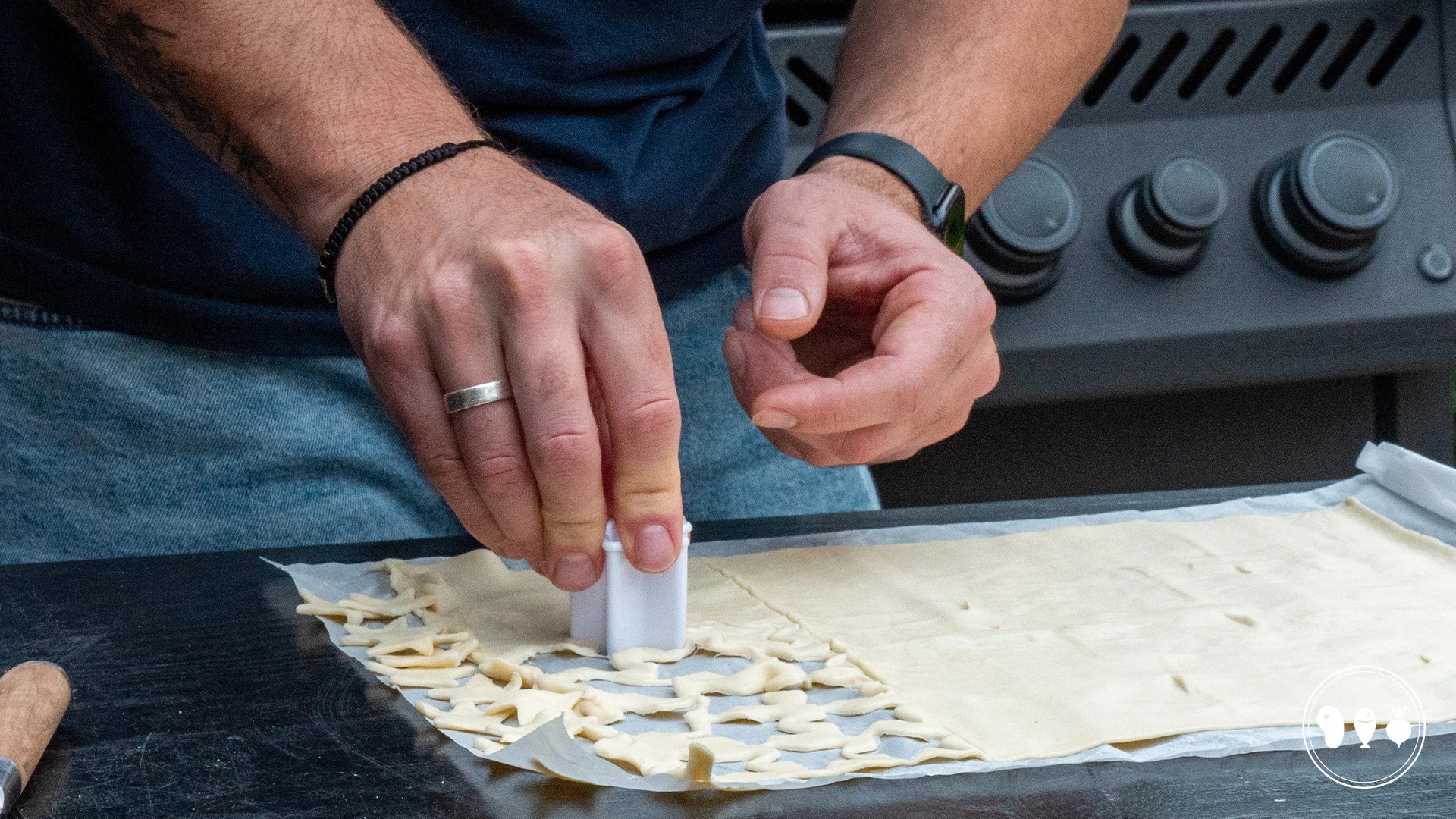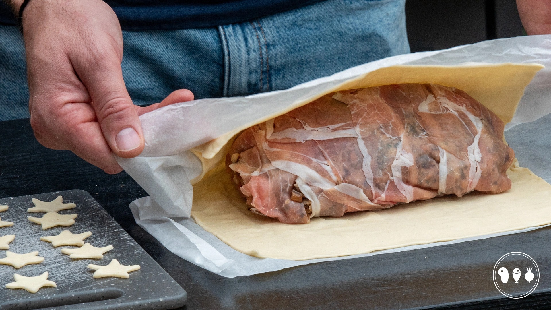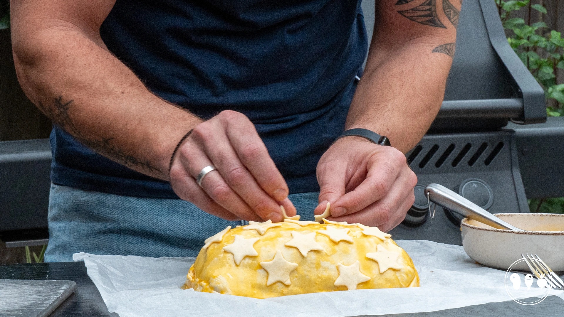 Plak de vormpjes op de wellington en smeer alles in met eigeel. Leg een velletje bakpapier op de pizzasteen of op de ovenplaat en daarop de kip wellington.