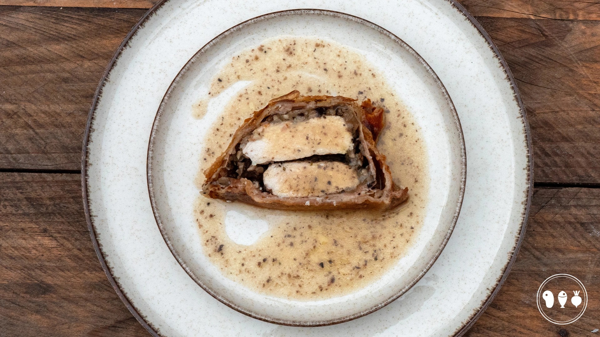 Snijd een mooie plak van de kip wellington en leg plat op een bordje. Serveer de bordjes uit en schenk op tafel de jus over de bordjes.